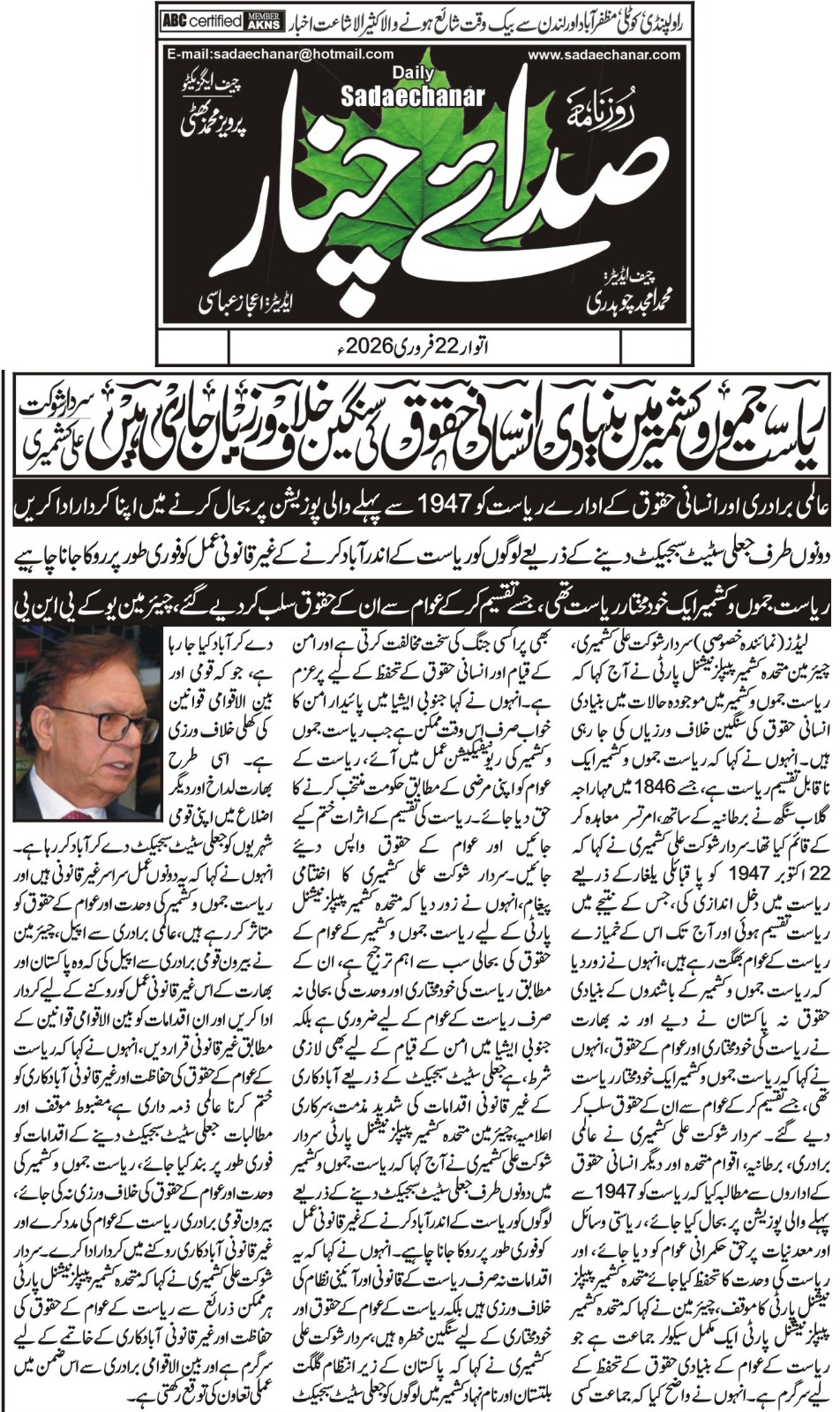 Serious human rights violations are taking place in the State of Jammu and Kashmir The illegal practice of granting fake state subject certificates to non state individuals on both sides and settling them within the State of Jammu and Kashmir must be stopped immediately Sardar Shaukat Ali Kashmiri